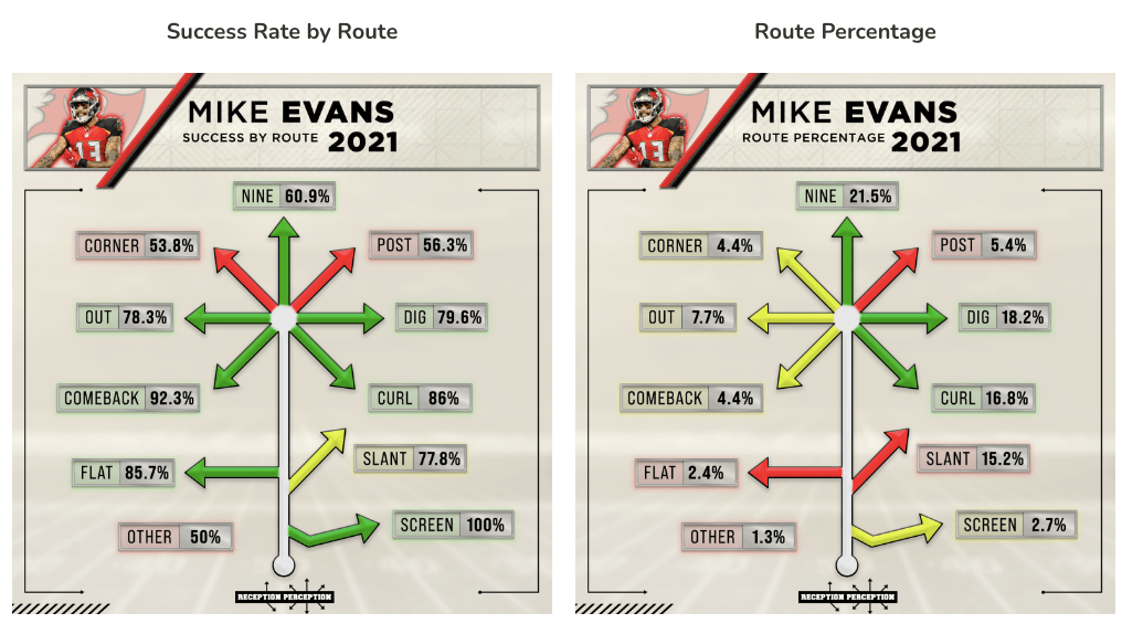 Ennél még fejlettebb a megfutott útvonalanként szerzett yardok mutatója (Yards Per Route Run), hiszen ez a sérülések mellett már azt is kikerüli, hogy az adott támadósor passz- vagy futásorientált volt-e. Hiszen ha valaki úgy szerzett 1000 yardot, hogy az irányítója 500-szor passzolt, akkor az jóval hatékonyabb volt, mint akinek az irányítója 800-szor lépett hátra passzolni (és ő maga végig egészséges volt).