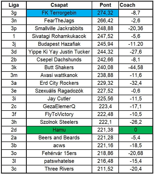 Továbbra is nagyon erős a mezőny, minden liga nyertesének sikerült átlépni a 200 pontos határt. A legjobbak legjobbja a héten FK Terrorgebin lett, ráadásul egy szinte tökéletes csapattal, miközben a legnagyobb arányú győzelmet is ő aratta. Duplázni viszont nem lehet, így a második legnagyobb arányú győzelmet jegyző FearTheJags viheti haza a páros főzdetúrát (266,42 pontot szerzett 144,98 pont ellenében), míg a tökéletes csapatért járó nyeremény Hamué, aki egyetlen pontot sem hagyott a padon: