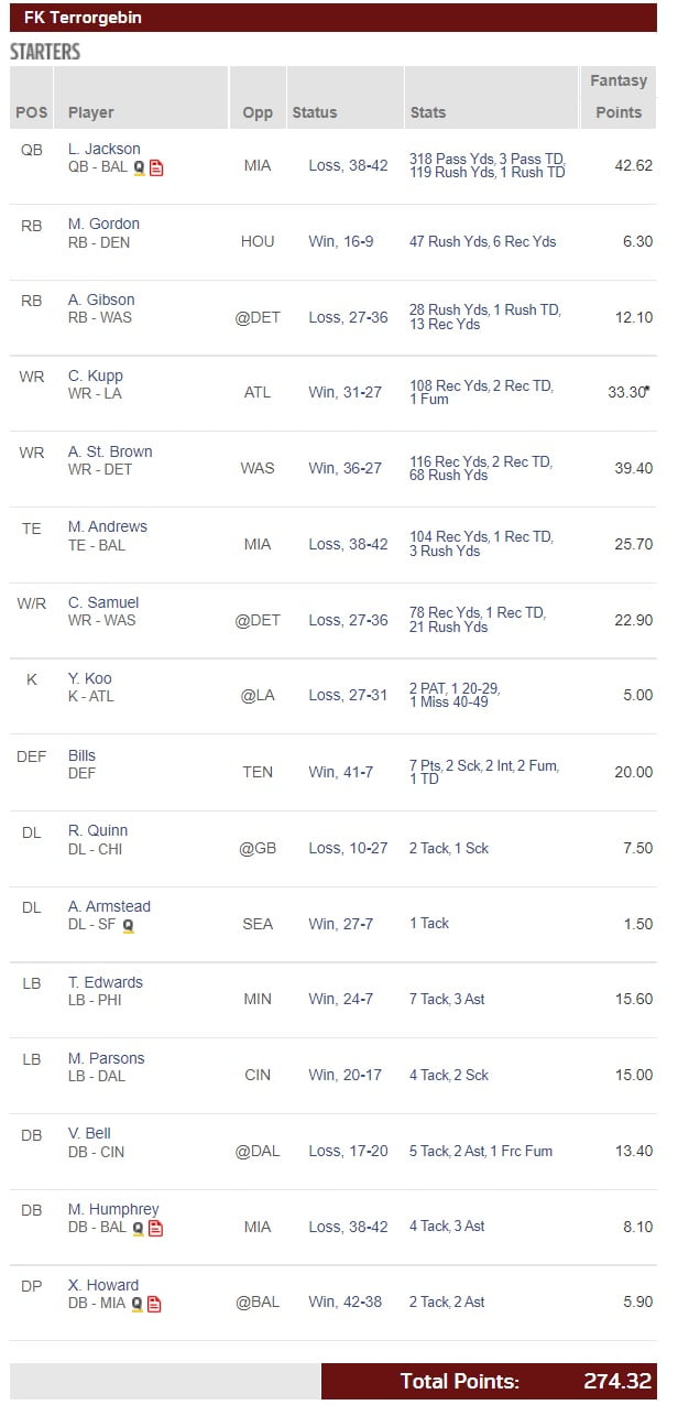Ez előző héttel ellentétben Terrorgebinnél az offense vitte a prímet, a Dolphins trióját leszámítva mindenki itt volt, aki nagyot ment a fordulóban. A védelemre sem lehet persze panasz, hárman is 10+ pont fölött termeltek, plusz a Bills védelem is 20 pontot tett a közösbe: