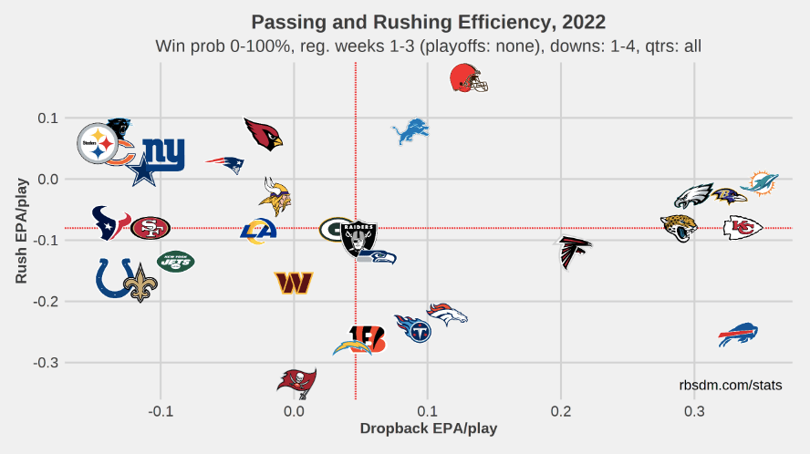 Ha megnézzük az alábbi ábrát, ami a csapatok offense és defense oldali EPA/play mutatóit ábrázolja, akkor kirajzolódik négy rendkívül jó csapat és még két rendkívül jó támadósor.