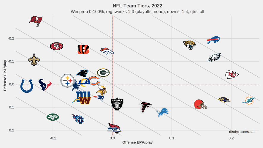 Ha megnézzük az alábbi ábrát, ami a csapatok offense és defense oldali EPA/play mutatóit ábrázolja, akkor kirajzolódik négy rendkívül jó csapat és még két rendkívül jó támadósor.