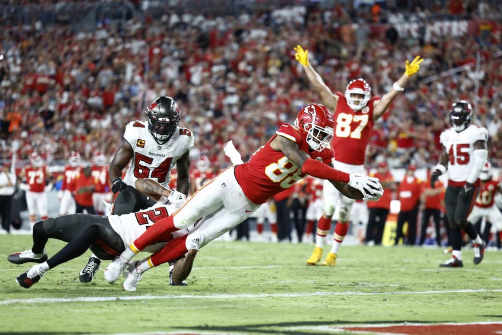 Mahomes to Kelce! #ChiefsKingdom comes out HOT. #KCvsTB on NBC and @peacock. pic.twitter.com/qPcchplhC6