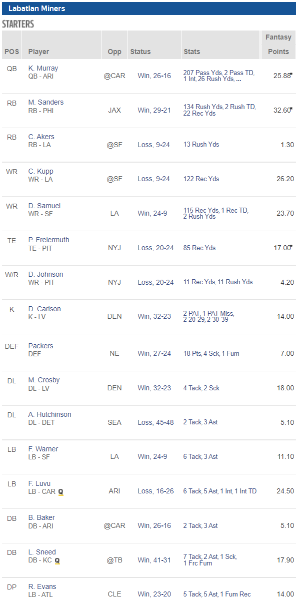 Hiába volt Cam Akers ezúttal is borzalmas, a Sanders, Murray, Kupp, Samuel négyes már önmagában 110+ pontot termelt, innen pedig szinte csak elbukni lehetett a meccset. A védelemben is akadtak szép teljesítmények, Luvu például óriási fogás volt, ritkán szerez egy védő 20+ pontot: