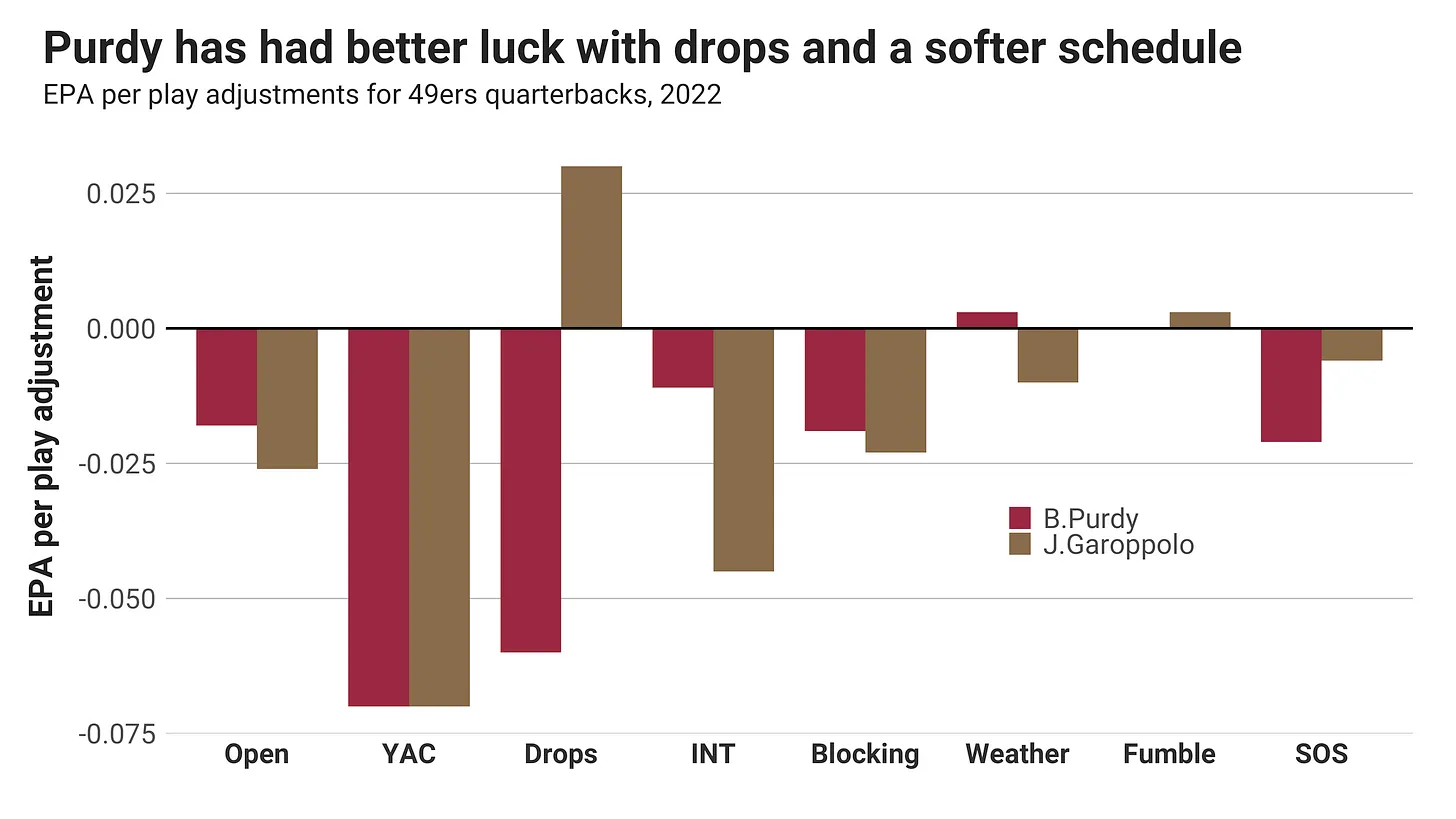 A legnagyobb különbséget ezek alapján a dropok jelentik, ugyanis míg Purdy esetében csak 2,2% volt a drop mutató, ami a legalacsonyabb a ligában, addig Garoppolónál 6,3%, ami a 10. legmagasabb volt. Ezen kívül elég könnyű ellenfelekkel kellett szembenéznie Purdynek, csak egy top10-es passzvédelemmel találta szemben magát (eddig a pontig, mert a divisional körös Cowboys elleni még nem volt benne a számokban), míg ezen kívül csak bottom15-ös passzvédelmek ellen lépett pályára. Az is feltűnő, hogy mindkét irányítót mennyire segítik az elkapás utáni yardok egyrészt a séma, másrészt a skill playerek hathatós közreműködésével.