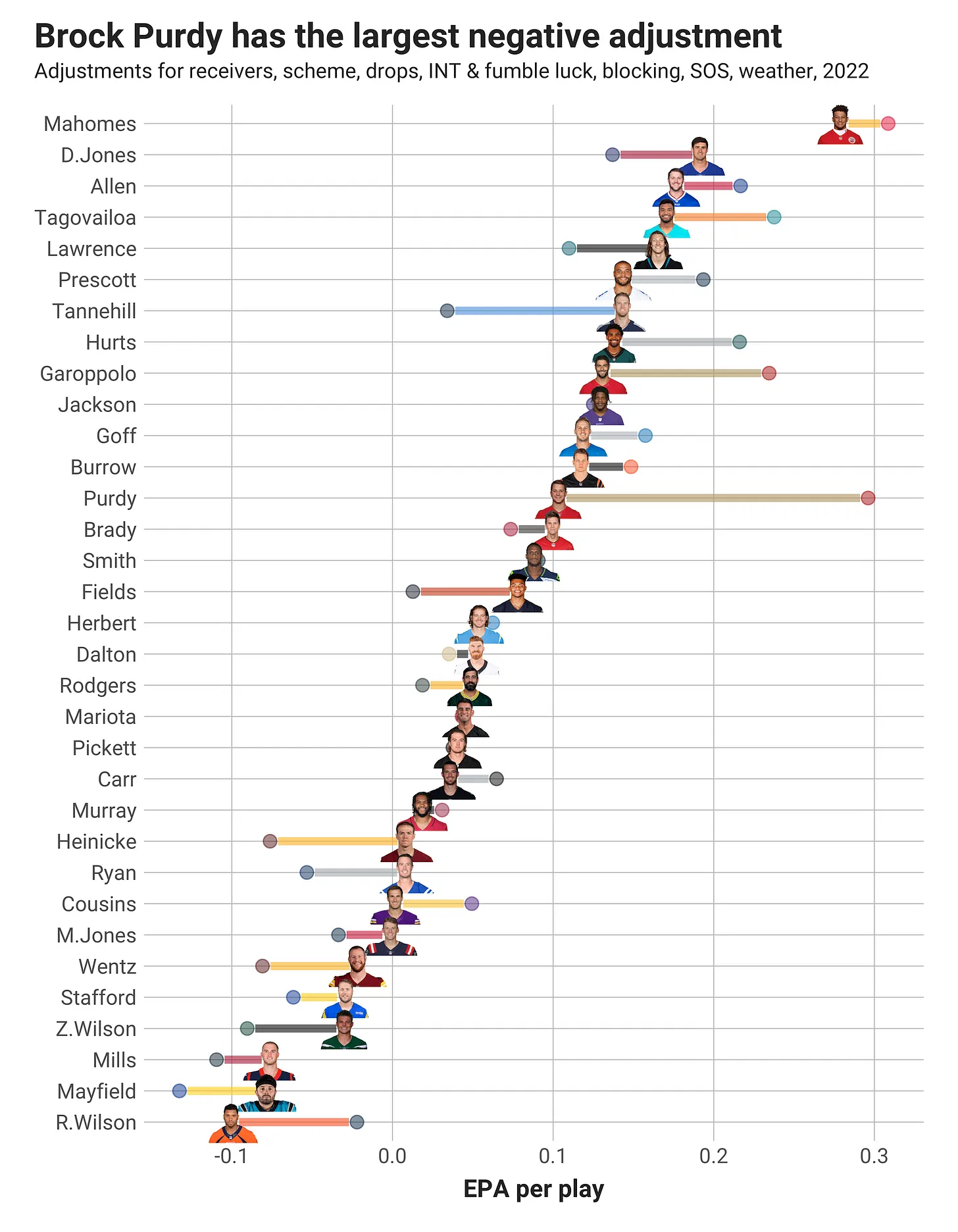 Purdyre koncentrálva ez azt jelenti, hogy ugyan EPA/play alapján ő volt a második legjobb a ligában, de ha a körülményeit figyelembe vesszük, akkor csak a 13. helyre ér fel. A teljesítményének kétharmadát külső tényezők adják, ezáltal magasan ő a leginkább kisegített irányító a ligában. És egyébként Jimmy Garoppolo a második legjobban kisegített irányító idén, bár jóval kevésbé, mint Purdy (McCaffrey érkezése nagyot dobott a támadósoron), így a faktoroktól mentesen még jobb teljesítményt is nyújtott az újoncnál.
