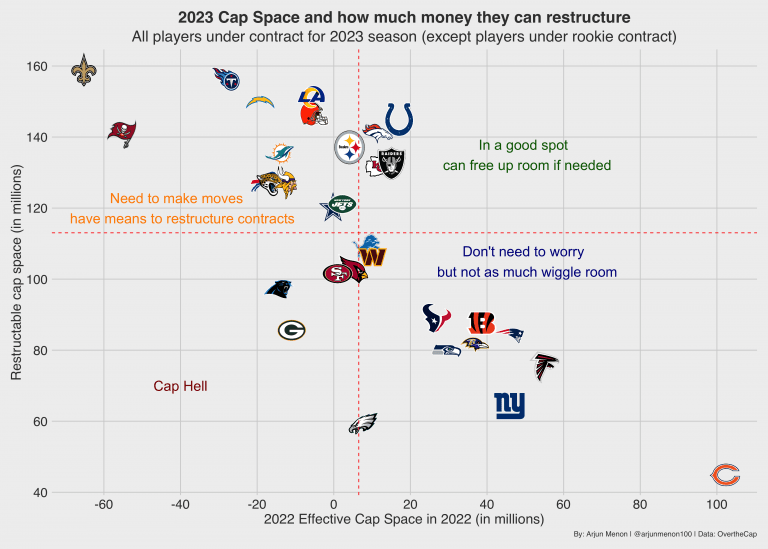 A fizetési sapka azonban elég rugalmas tud lenni (lásd Saints 2021-2022), így ehhez a grafikonhoz érdemes egy kis kontextust is adni. Menon ezért azt is megnézte, hogy a rendelkezésre álló fizetési kerethez viszonyítva mennyi összeget tudnak a csapatok spórolni szerződések átalakításával.