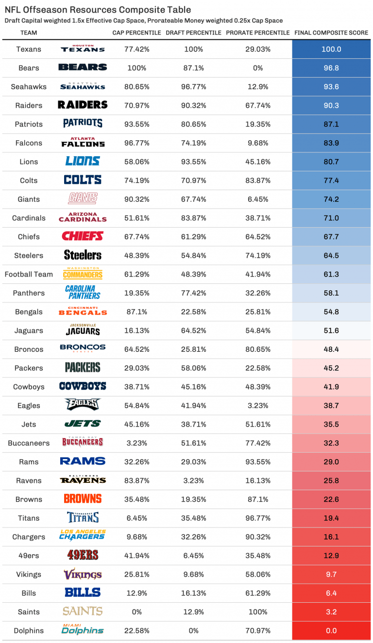 A legjobban a Texans és a Bears áll, előbbi a legtöbb drafttőkével, utóbbi a legtöbb pénzzel és nem mellesleg az 1/1-es pickkel a birtokában. Drafttőkéből szintén nem meglepő módon a Seahawks és a Lions áll még nagyon jól a tavalyi cseréknek köszönhetően, pénzügyileg pedig a Falcons, Patriots, Giants, Bengals, Ravens ötös áll még elég jól. Negatív irányban a draft szempontjából, a Saints, Vikings, 49ers, Dolphins, Ravens ötös áll a legrosszabbul, mivel játékosra cserélték a pickjeiket, pénzügyileg pedig a Saints és a Buccaneers van a legnehezebb helyzetben.
