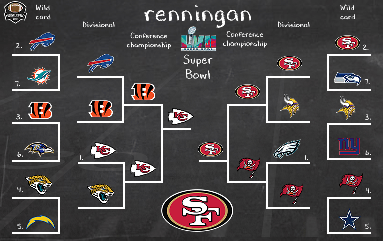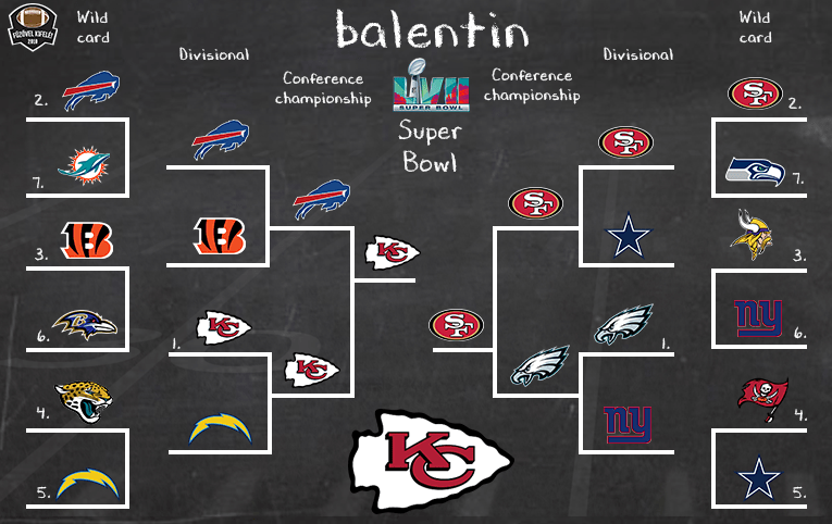 A wild card körben papírformákkal indítok, de a többséghez képest talán egynél több meglepetést is jósolok. A Giants idegenbeli győzelme mellett a Jaguars és a Buccaneers sikere a Chargers illetve a Cowboys felett mindenképp ebbe a kategóriába tartozna. Az NFC-ben ennek ellenére nem gondolom, hogy borulna a papírforma és egy körrel később a két “nagyvad”, a 49ers és az Eagles diadalmaskodik. A konferencia döntő eredményét volt számomra a legnehezebb megtippelni, de végül Kyle Shanahanre és a vendég nyugati partiakra tettem le a voksom. Az AFC-ben már nem volt ilyen egyszerű a helyzet. A Chiefs otthoni sikere a Jaguars ellen könnyen, a Bengalsé a Bills felett már nehezebben született meg a fejemben. A Hamlin sérülése miatt elmaradt meccs újrajátszásánál azonban a szezon végére remek formába lendülő Cincinnatit juttattam tovább. Az AFC döntőben tehát újra összejöhet a Mahomes vs. Burrow slágermeccs, ahol nem tudom elhinni, hogy Mahomes zsinórban negyedszer is alulmaradjon. A Super Bowl így a Chiefs és a 49ers közt dőlne el, előbbi sikerével. Az MVP megnyeri a bajnokságot, ami mivel igen ritkán szokott megtörténni, vélhetően most sem fog.