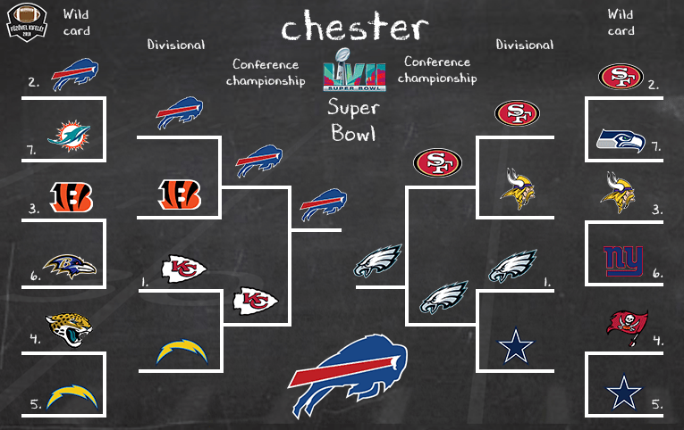 AFC oldalon a wild card körben három meccsből kettőre sima hazai győzelmet várok. Meglepne, ha a Bills és a Bengals dolgát a Dolphins vagy a Ravens komolyabban meg tudná nehezíteni. A harmadik összecsapás viszont egy kiegyenlített csatát hozhat, ahol végül a Chargers egy győzelemmel utazna vissza a nyugati partra. A következő körben talán az egész rájátszás egyik legjobb mérkőzése várhat ránk, a Bills-Bengals meccsen könnyen meglehet, hogy egy olyan élményt kapunk, amit egy jó darabig nem felejtünk el. A Chiefs-Chargers csoportrangadón az első kiemelt jut tovább és játszhat a Bills ellen. 2022 után a Bills és Chiefs most egy körrel később csap össze, de egy ugyanolyan emlékezetes csatát várhatunk, ahol most fordított eredményt várok, így az AFC-t a Bills nyeri meg és utazhat Phoenixbe.