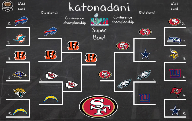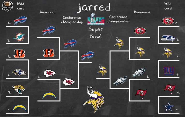 Ez a playoff rengeteg jó történetet kínál, én most azt a változatot választottam, amit én a leginkább látni szeretnék. Ez pedig a két sokat szenvedett franchise döntője lenne. Mind a Bills, mind a Vikings korábban 4 Super Bowlt játszott, és mind a négyet el is bukta. Most azonban eljött az ötödik próbálkozás ideje. A Dolphins Tua nélkül értelemszerűen nem fog akadályt jelenteni a Billsnek, így bepótolhatják az elmaradt Bengals elleni találkozót, ahol egy epikus küzdelemben végül nyerni fognak. Ezután jön semleges pályán az AFC döntő a Chiefs ellen (akik a Chargerst harmadszor is elverik), ahol végül hosszabbításban harcolják ki a továbbjutást a nagydöntőbe. A másik ágon a Vikings ugyanazt fogja csinálni, mint eddig egész szezonban. Szoros meccsen veri előbb a Giantset, majd a 49erst is, az NFC döntőben azonban meglepően könnyen fog túljutni az Eaglesön (inverz 2017 NFC döntő). Így mindkét együttes ötödszörre fogja megkísérelni a Lombardi trófeát elhódítani, és végül egy végletekig kiélezett küzdelemben a Vikings fog diadalmaskodni stílusosan 1 ponttal!