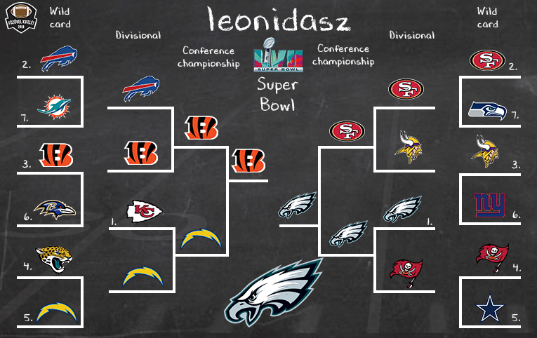 AFC oldalon már jóval érdekesebb a helyzet a divisional körtől, ugyanis a Chargers mindig problémákat szokott okozni a Chiefsnek, de nem tippelek Andy Reid ellen (non Super Bowl) bye weekről érkezve. A Bills-Bengalsra való jósláshoz jó lett volna látni az egymás elleni meccsüket, így kevesebb infóval kell tippelni. Mivel két hete a Bengalsra tettem, így maradok ennél, de Josh Allen Super Saiyan módba kapcsolása nem lepne meg. A konferenciadöntő így megismétlődne tavalyról, és a Bengals uralja ezt a párharcot, jók a matchupok, így maradok mellettük, még ha a sérülések miatt felforgatott támadófaluk jobb oldala miatt aggódok is, és hát Mahomes ellen sem fog kétszer ugyanaz működni.