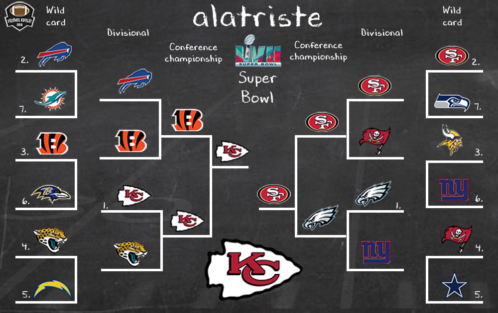 Az AFC Wild Card egyszerű, hisz a Dolphins és a Ravens csereirányítóval lép pályára, a Chargerst pedig nem tudom komolyan venni azok után, hogy egy teljesen tét nélküli meccsen játszatta a kezdőiket a Broncos ellen és még így is kikapott. A második körben a Bills-Bengals találkozó egy Super Bowlnak is elmenne, így nagyon nehéz tippelni, de az elmúlt hetek történései és az aktuális forma alapján inkább a Bengalsra fogadnék. A másik divíziós kör pedig nem lehet kérdés, ez a Jaguars még mindig nem egy jó csapat, így a tavalyi konfdöntő visszavágót megismétlik – amit kivételesen Patrick Mahomes csapata nyer meg.