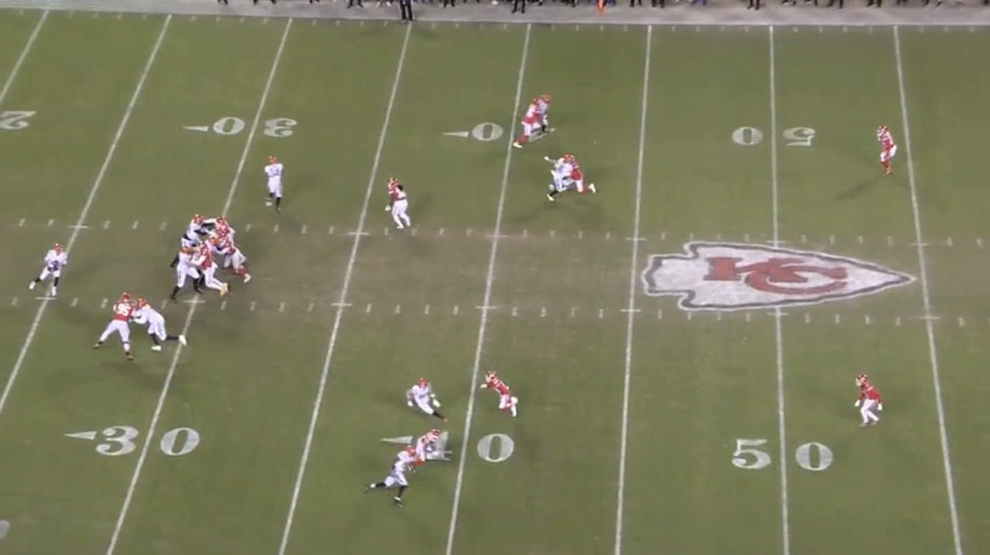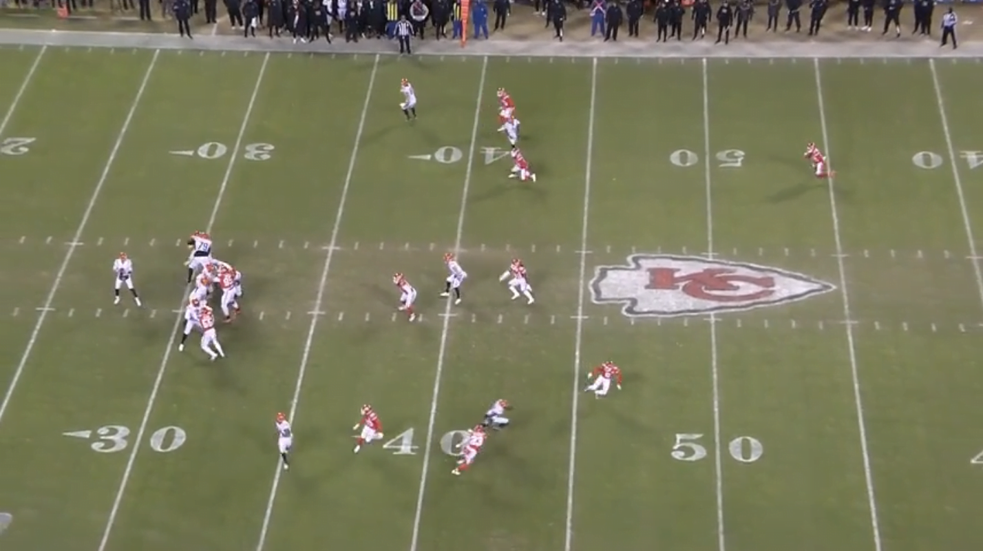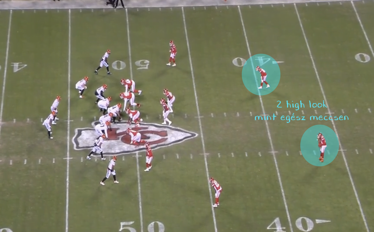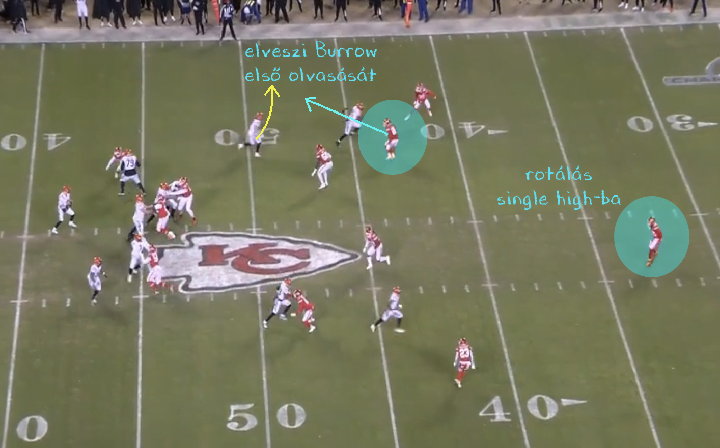 Két mély safetyt mutat tehát a snap előtt a Chiefs, amúgy pedig zónázást. Bőven volt ilyenre példa az elején, ez előtt nem is rotáltak a snap után, tehát Burrow bízhatott abban, hogy ez így is marad.