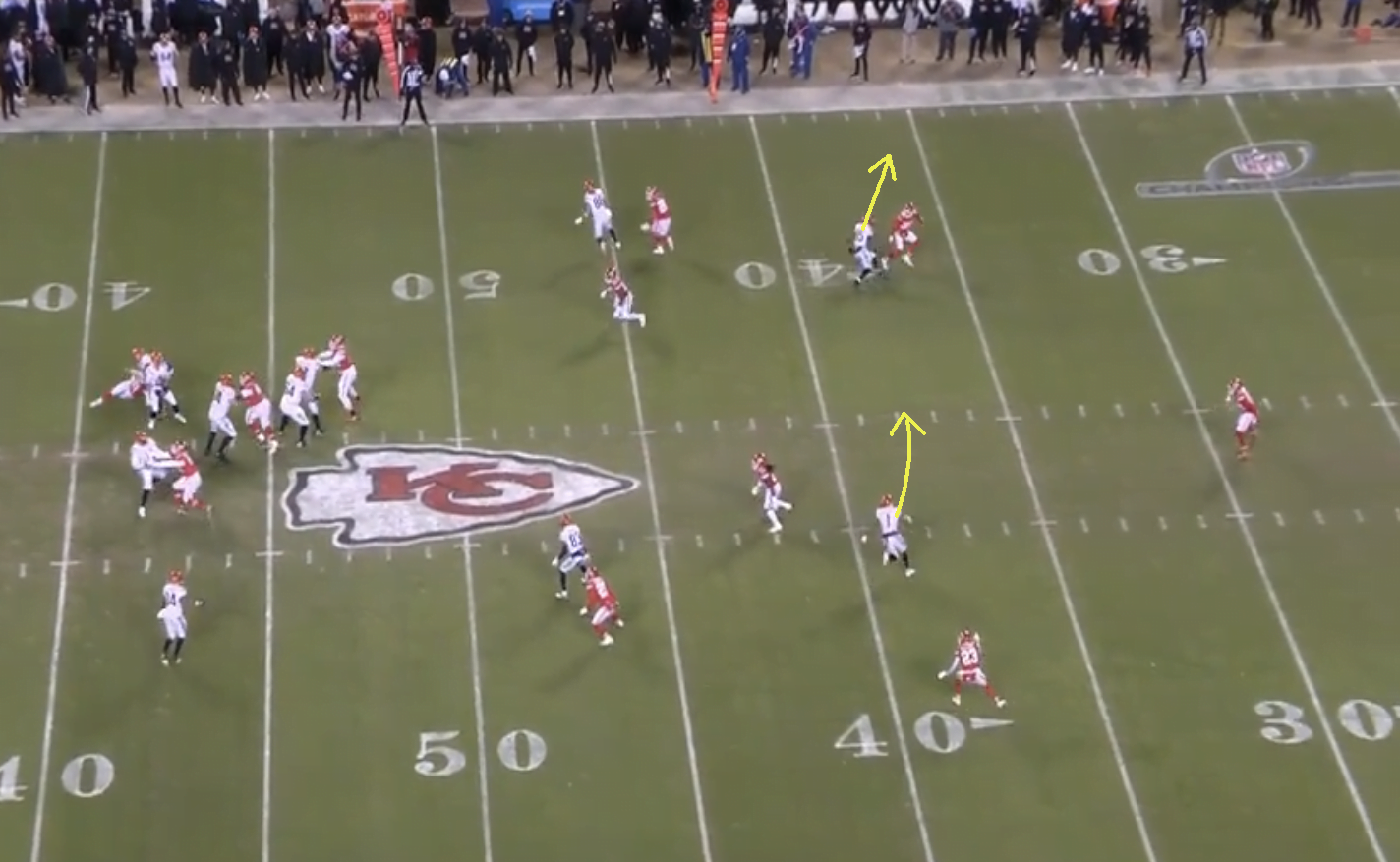 Chase jobb oldalon izolálva van a CB-vel, de a két mély safety miatt valójában ketten figyelnek rá. Így a túloldalra kell játszani, ahol két elkapó van három védőre, tehát a safety nem tud az egyikükre koncentrálni. Itt Tee Higgins fut egyenesen az oldalvonal mellett. Az alábbi képen látható, hogy gyakorlatilag senki sincs szabadon, kiválóan védekezik a Chiefs.