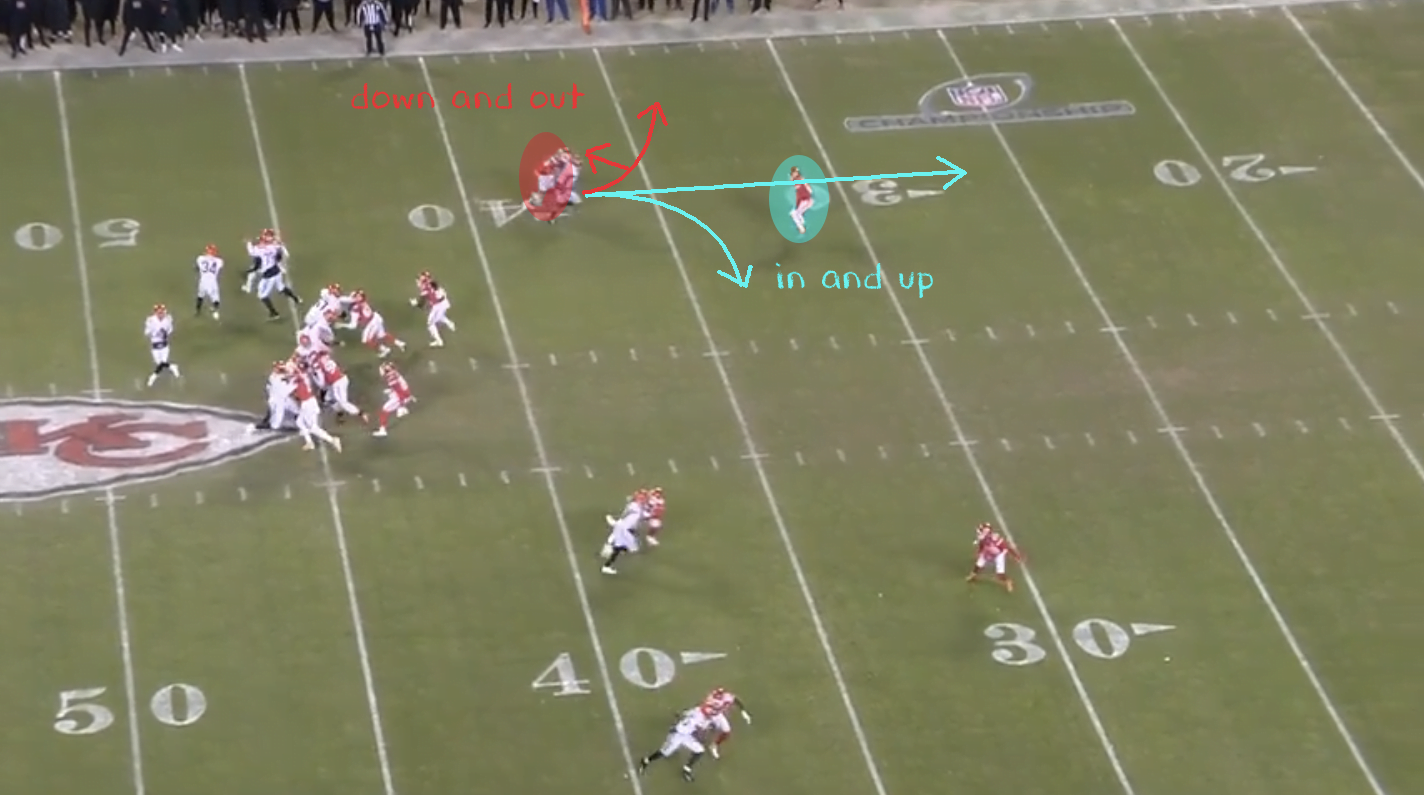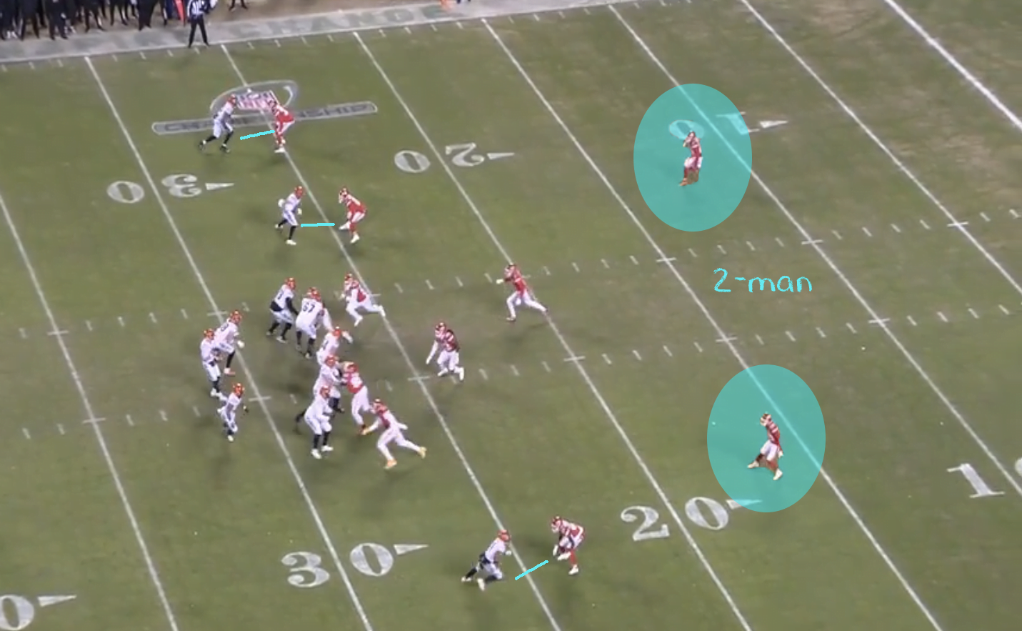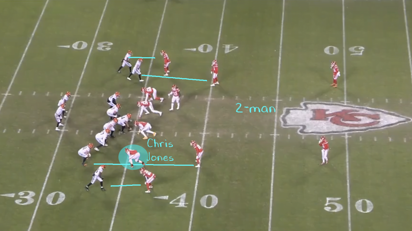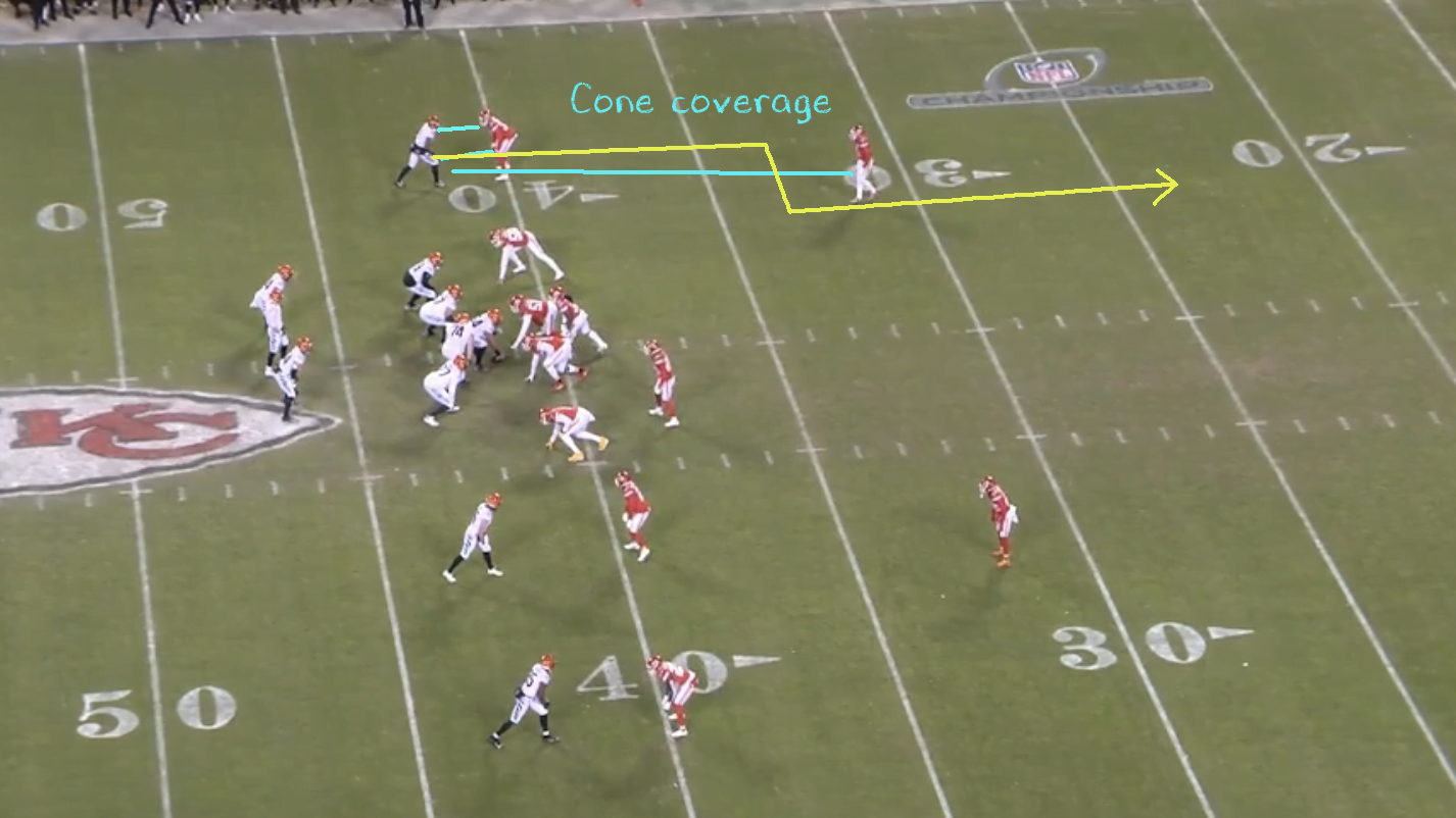 A Chiefs úgynevezett cone coverage-et használ, ami azt jelenti, hogy a cornerback feláll az elkapó külső vállára és befelé tereli a snap után. Úgy duplázzák be, hogy a cornerback kívülről és lemaradva követi Chase-t, a safety pedig belülről és felülről felügyeli. Így tehát a CB felelős minden kifelé törő útvonalra és minden visszafordulóra, a safety pedig minden befelé törőre és minden mélyre. Ezzel szinte ellehetetlenítik, hogy neki dobják a labdát.