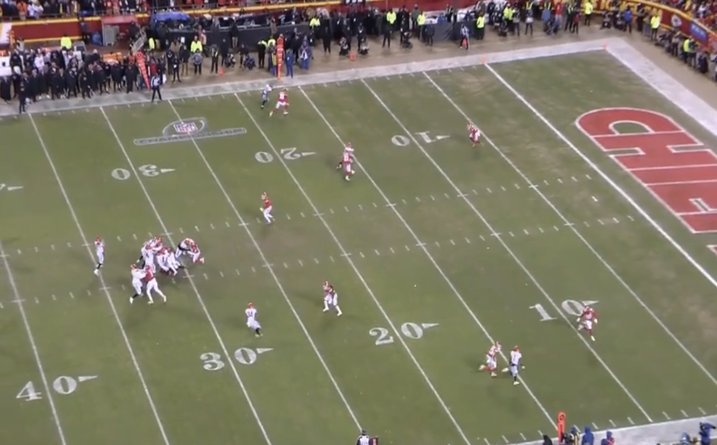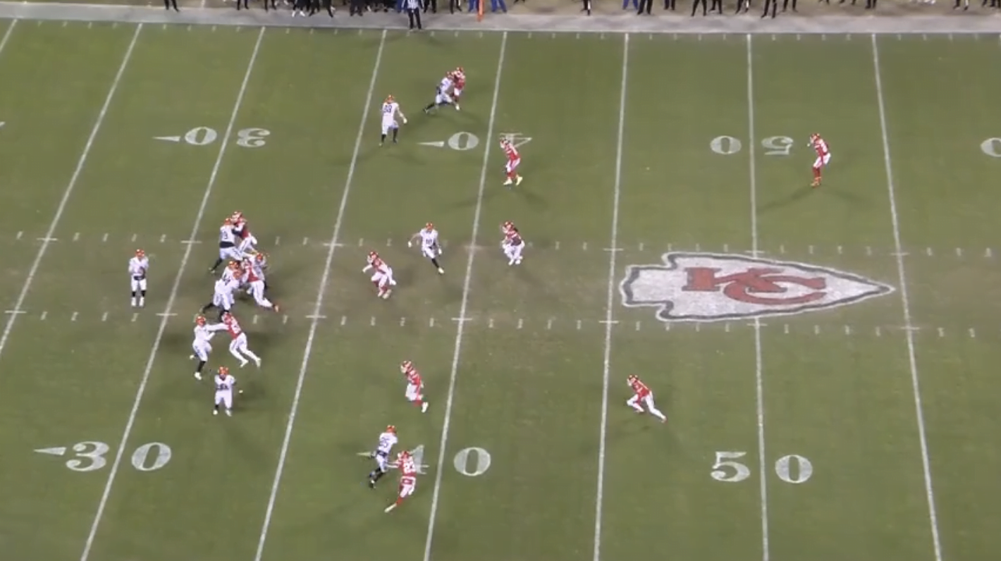 Ahogy mondtam, a Chiefs szinte végig két mély safetyvel védekezett a mérkőzésen. Így kezdtek és sikeresek is voltak ebben az első negyedben. Azonban hogy ne legyen kiszámítható a védelem, a második negyedben bedobtak egy rotálást és sackelték Burrow-t.