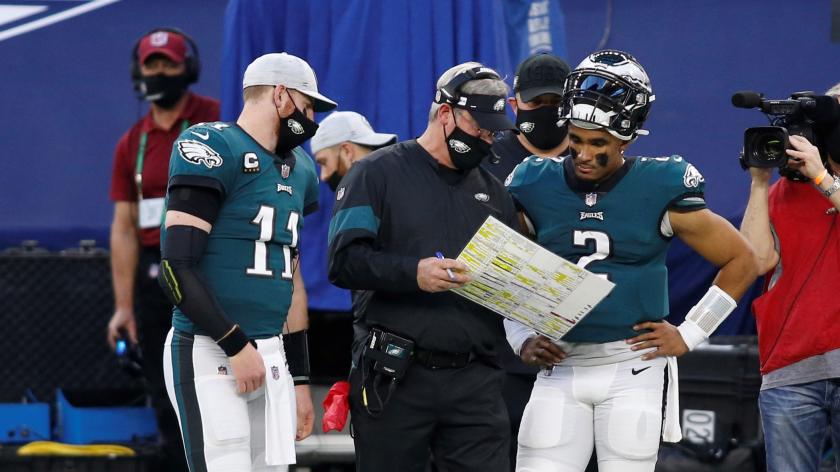 A 2020-as Philadelphia Eagles már egyre kevésbé hasonlított a korábbi bajnokcsapatra, az apró bomladozás után pedig év közepére teljesen összeszakadtak. Ilyen helyzetekben lenne szükség a jól fizetett, harcedzett franchise QB-ra, de Wentz nem így viselkedett. A pályán a legfőbb gond az elkapók hiánya volt. Erre az 1. körös Jalen Reagor beépítése sem jelentett gyógyírt, sőt. A támadófal is bizonytalan volt, Wentz pedig katalizátorává vált a problémáknak; túlvállalta magát, sok rossz döntést hozott, és példátlan módon kijátszotta magát a csapatból. Doug Pederson jól látta meg, hogy egy nehezen működő offense-be egy mobilis QB stabilabb alapot ad, Hurts egy-egy földön lopott first downnal meghosszabbította a drive-okat, és összességében jobban működött vele a csapat. Néhány kezdő meccse volt csak decembertől kezdve, de a nyers statisztikákat nézve komoly mérföldköveket ért el igen gyorsan, miközben nem vették körül klasszisok. A zárómeccsre már rég eliminálódott az Eagles, de jól mutatja Hurts kvalitásait, hogy emlékezetes módon, a draft-pozíciót manipulálandó Pederson inkább kivette a 2. körös rookie-t a csapatból, nehogy a Washingtonra is ráírjon 300+ yardot. Más kérdés, hogy a gyenge szezonba a vezetőedző belebukott.