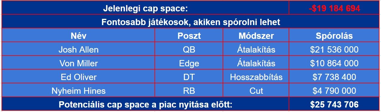 A csapat jelenleg 19,1 millió dollárral lépi túl a fizetési plafont, vagyis már ahhoz is komoly átalakítások kellenek, hogy megfeleljen a szabályoknak és le tudja igazolni az újoncokat. A Bills szerencséjére elég sok játékosnak a szerződésével lehet trükközni és akár 60-70 millió dollárt is könnyedén fel lehetne szabadítani, de ez nem túl életképes stratégia hosszú távon és jó eséllyel nem is fog megtörténni. Cap space-re viszont szükség van és a legkönnyebben az alábbi módon lehet összehozni: