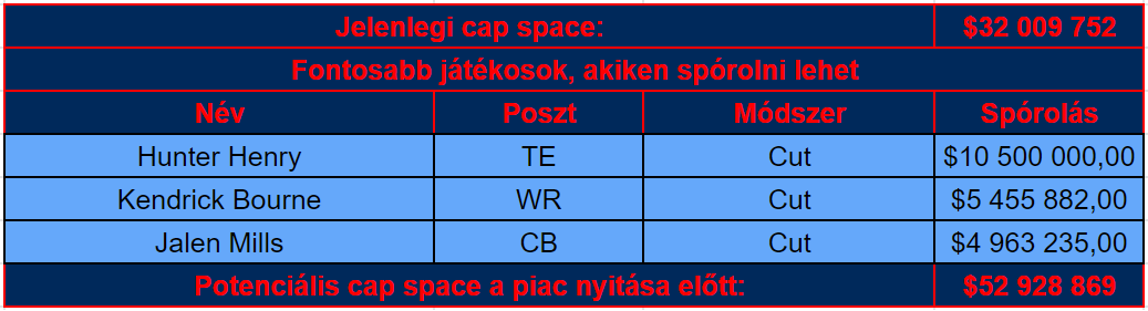 A New Englandnek 32 millió dollárnyi cap space áll a rendelkezésére már most, ráadásul ezen nagyon könnyen javítani lehet pár korábbi bust igazolás elküldésével: