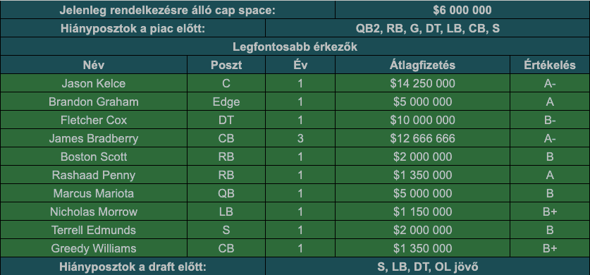 Hiányposztokat tekintve a támadósorba legfeljebb egy WR3 kellene, illetve majd a jövőre kell gondolni a támadófalban, hiszen Kelce visszavonulásával majd a center vagy a guard poszt hiányos lesz, illetve Lane Johnsonnal is két évre lehet számolni legfeljebb. Nem sürgető dolgok, de érdemes előre tervezni. A védelemben azért rosszabb a helyzet, a safety egyértelmű hiányposzt, és a linebacker is csak akkor nem, ha a tavaly nagy reményekkel draftolt Dean kész a nagy szerepre. A védőfal közepén is lehetne erősíteni, a Jordan Davis, Fletcher Cox, Milton Williams trió ugyan nem rossz, de egy contender csapatnál ennél többre lenne szükség, főleg hogy mélység nem nagyon van és Cox távozásával is számolni kell jövőre.