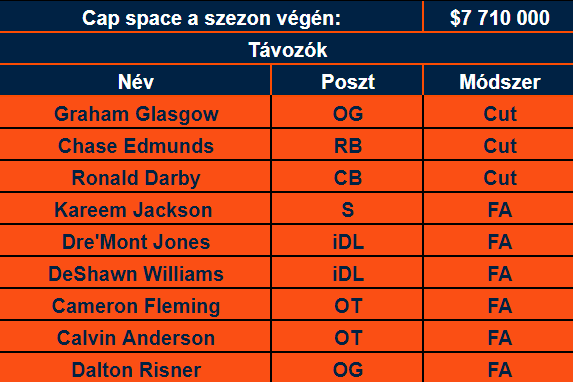 Erre nem lett volna lehetőség anélkül, ha előtte nem teremt egy kis szabad pénzt a gárda. Így a nyitás előtti napokban lényegében megszabadultak mindenkitől, akitől kötelező volt. Chase Edmunds, Ronald Darby és Graham Glasgow is távozott. Egyikükért sem különösebben kár, főleg a felszabaduló forrásokhoz viszonyítva. A szezonvégi 33 millió dollárból így hirtelen közel 60 millió volt a mozgástér, ami elég jó pozíció volt a piacon.