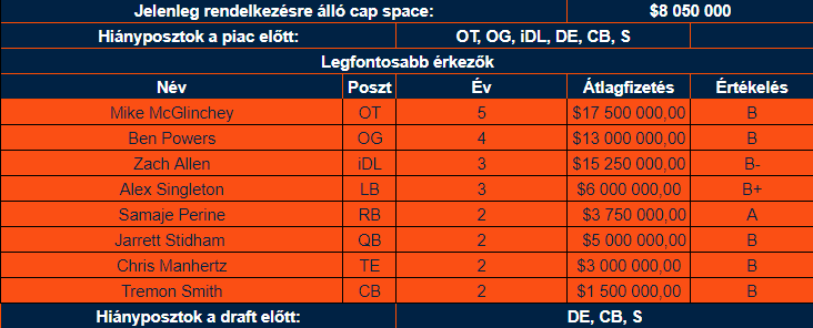 A Denver Broncos új vezetőedzővel esett neki a holtszezonnak, ráadásul nem kisebb név, mint Sean Payton érkezett. Egy ekkora kalibernek pedig meg kell próbálni a kedvében járni, így várható volt, hogy nem ülnek tétlenül a csapatnál.