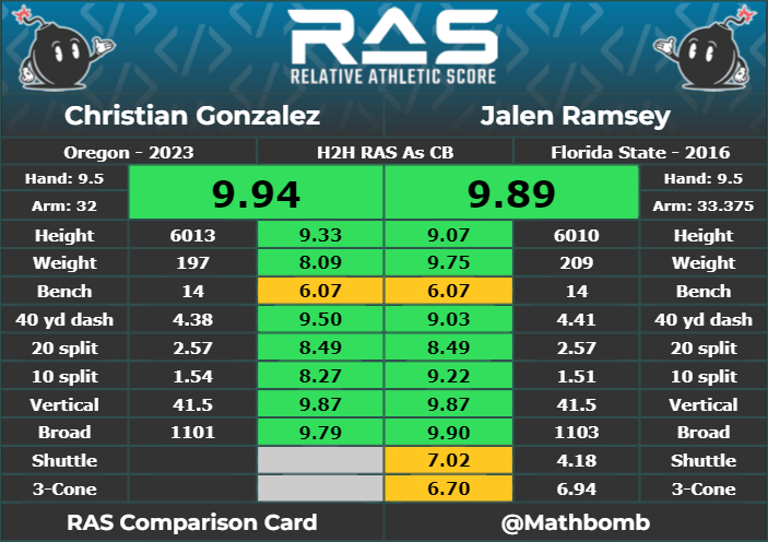Gonzalez a prototípus cornerback. 185 centiméter magas (6’1″), ami pont elég ahhoz, hogy fel tudja venni a versenyt a magasabb elkapókkal, de nem túl magas, hogy ne legyen meg a gyors irányváltó képessége és a robbanékony stílusa. A meccsfelvételeken ezek látszódtak is és várni is lehetett tőle egy kiemelkedő Combine-t. Ezt pedig tökéletesen meg is hozta. Karjai hosszúak és a karfesztávolsága is bőven átlag feletti. A fizikai adottságok után pedig megmutatta, hogy mozogni is tud. Súlypontemelkedése és távolugrása a felső 4%-ban van, abszolút a poszt legteteje. A 40 yardos ideje is felső 11%-ba repíti (4,38mp). A spider chartja közel tökéletes kör. A fordulékonysági felmérőket ugyan kihagyta, de ez inkább taktikai döntés volt (a pro dayen sem csinált), hiszen így is olyan eredményeket mutatott, amibe nem lehet belekötni. Csak összehasonlításképpen, jobb atléta mint Jalen Ramsey. A cornerback pedig az a poszt, ahol különösen fontos az atletikusság. Ha nem tudod sebességben, ruganyosságban lekövetni a mozgásokat, sosem lehetsz gyenge közepesnél jobb játékos.