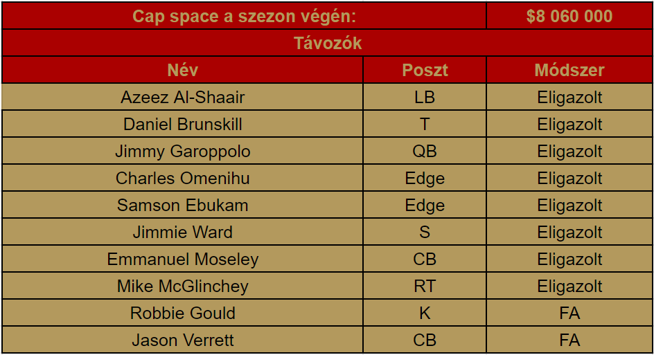 A távozók listája tetemes. Jimmy Garoppolót senkinek nem kell bemutatni: egy átlagosnál talán kicsivel jobb kezdő irányító, aki bár tökéletesen illett Kyle Shanahan rendszerébe, a sérülékenysége és a limitáltsága, valamint a relatíve magas bérigénye miatt nem lehetett maradása. Szintén nem nagy kár a folyamatosan sérüléssel bajlódó Jason Verettért és Emmanuel Moseley-ért, de még a veterán ikon Robbie Gouldért sem. Előbbi kettő inkább a rotációban lehetne igazán hasznos, az régen rossz (vagy még inkább öngyilkosság), ha kezdőként kell velük számolni, utóbbi pedig a posztjából adódóan relatíve könnyen pótolható.