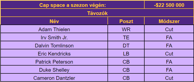 A támadósor egyetlen fontos távozója a már kissé megkopó elkapó. Thielen prime időszaka nem most volt már, de Stefon Diggsszel pár éve még a liga egyik legjobb elkapó duóját alkották. Jefferson társaként így is egy jó második számú elkapó volt, de az új idényben már 33 éves lesz, egyértelműen lefelé megy már a teljesítménye és nagyon drága is volt. A 20 milliós cap hitjéből azért így is 14-et be kell nyeljen a csapat halott pénzként, de mivel nagyon szűkös az anyagi helyzet, valahol érthető a döntés. Ezzel azonban az így is elkapó híján lévő keretben az eddigi közepes lyuk óriásira tágult és a csapat gyakorlatilag legnagyobb needje lett a WR poszt. Jefferson egy elit játékos, de úgy forgolódik az elkapószobában egyedül mint Travolta a Ponyvaregényben.