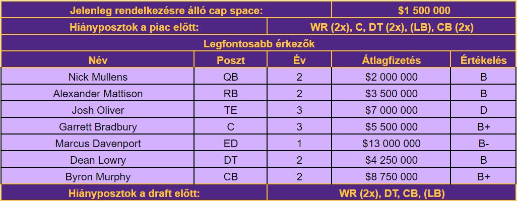 Volt egy erős fiatalítás a csapatnál, hiszen három veterán, meghatározó játékos is távozott. Összességében azt talán el lehet mondani, hogy nem sokat változott a keret minősége. Nagyon égető need nem maradt, de elkapó, belső védőfalember és corner is még jöhetne, hiába az 1-1 jobb nevű free agent igazolás, ezeken a posztokon több minőség ment mint jött. Az offseason nagy híre persze az volt, hogy Cousins szerződését nem hosszabbította meg a csapat és utolsó évébe lép az aktív kontraktusának. Ha pedig ez nem változik, akár a távozása is esélyes.