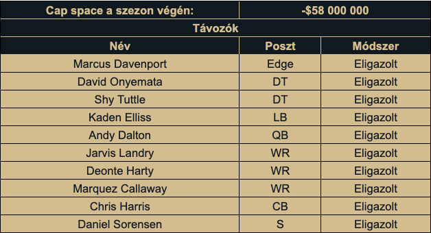 Mindezekkel össze se tudom számolni mennyit szabadítottak fel pontosan, de 80 millió felett van ez az összeg. Sok választásuk nem volt igazából, főleg hogy irányítót akartak szerezni maguknak, de azért több lépést meg lehet kérdőjelezni, például az elég komoly jogi ügyek előtt álló Alvin Kamara szerződéséhez való hozzányúlást, akire simán várhat eltiltást idén.
