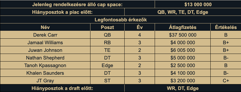 Nagy részükért persze nem kár, ilyen Derek Carr érkezésének fényében Andy Dalton, a kiöregedő és lelassuló Jarvis Landry, a szintén kiöregedő Chris Harris, vagy a sosem jó Daniel Sorensen. Hartynak és Callawaynek is voltak fellángolásai, mélyítésnek nem lennének rosszak a WR-sorba, de sírni sem kell utánuk.
