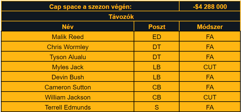 Nem volt túl sok mozgástere a csapatnak az FA időszakra kanyarodva, de ennek elsőszámú oka, hogy az alappillérei már meg vannak fizetve a Steelersnek. Ennek okán nem is távozott túl sok igazán fontos játékos.