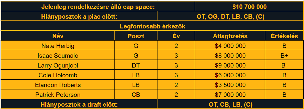 Nem alakult át gyökeresen ez a keret de nem is volt rá szükség. Másodvonalas megoldásokat hoztak a legnagyobb problémáikra, így nem az övék volt a legizgalmasabb free agency időszak, de cserébe a legdrágább sem. Az egység gerince egyben maradt, a védőfal továbbra is domináns lesz, akik mögött a secondaryben jó esély van a labdaszerzésekre. A támadóoldalon is a skill sor viszi a prímet, de a támadófal is kapott némi ráncfelvarrást.