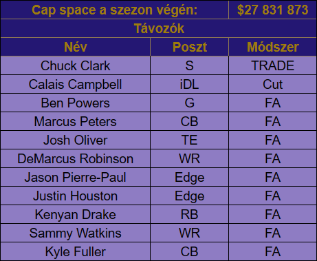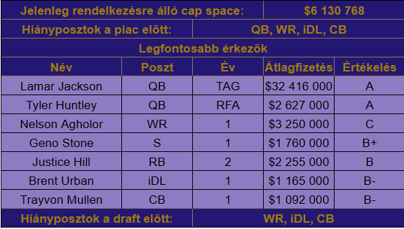 A fentiek után már volt elég pénz a kasszában ahhoz, hogy a várt franchise taget rárakják Lamar Jacksonra, viszont ez a garantált 32 milliós cap hit igazából el is döntötte a további költekezéseket. Néhány hosszabbítás belefért, de új igazolás csak egy volt.