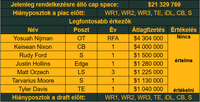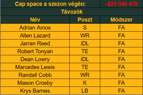 Minden jel arra mutat, hogy 15 év után nem Aaron Rodgersszel az irányító poszton vágnak neki a szezonnak, és Jordan Love kapja meg a csapatot. Azt gondolná az ember, hogy egy ilyen visszalépés miatt majd a keret megerősítésén lesz a hangsúly, de erről nem igazán lehetett szó mínusz 25 millió dolláros cap space-szel. Ezt elég hamar sikerült eltüntetni, hiszen sok nagy szerződésű játékosuk van. Kenny Clark, Jaire Alexander, David Bakhtiari és Preston Smith kontraktusainak átalakításával, illetve Aaron Jones masszív fizetéscsökkentésével egyenesen megfordította ezt a 25 milliót Gutekunst stábja, mindezt cutok nélkül.