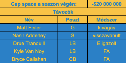 A Jaguarsnál is egy kivágást ejtettek meg, ami szintén sejthető volt: a cornerback Shaq Griffin nem nőtt fel a szerződéséhez, így két év után elküldték. Annyit semmiképp sem ért, mint amennyit fizetni kellett volna neki, és miután kikerült a kezdőből, jobban is nézett ki az egység, de azért ide még elfér az erősítés a drafton mondjuk. Fájó távozó lehet Jawaan Taylor, aki ugyan futásblokkolásban nem túlzottan használható, de passzblokkban elég jól teljesített a fal szélén. Persze amennyit a Chiefs adott neki (évi $20 milliót), annyit nem ért jelenlegi tudásunk alapján, ráadásul a csapatnál bíznak a két évvel ezelőtti második körös Walker Little-ben, hogy át tudja venni majd a helyét (vagy akár a draftról is érkezhet helyettes).