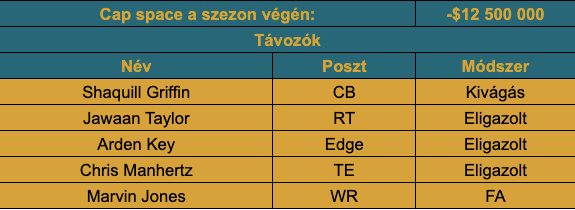 Arden Key tavaly elég jó igazolás volt, nagyon jól ugrott be a pass rush szekcióba, így hiányozni fog a jelenléte, de Josh Allen és Travon Walker mellett nagy erőforrást nem volt érdemes a posztra költeni. Manhertz egy blokkoló tight end, nem különösebben kár érte, ahogy a kiöregedő Marvin Jonesért sem, hiszen tavaly megszerezték az idén visszatérő Calvin Ridley-t.
