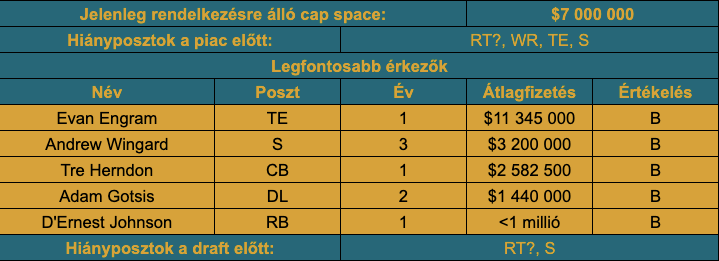 Wingard visszaigazolása is rendben volt, a safety poszt talán számít a leggyengébb a csapatnál, de így legalább van három relatív használható opciójuk (Andre Cisco és Rayshawn Jenkins a másik kettő). Ide elférne majd még erősítés akár idén, akár jövőre, ez a szerződés pedig nem is gátolja meg a csapatot semmiben ezzel kapcsolatban. A secondaryben Tre Herndon maradt még, aki a slotban egy használható figura, de az esetében is igaz, hogy lehet upgrade-elni rajta a jövőben. A védőfalba igazolták még újra Adam Gotsist, ami mélyítésnek szintén rendben van.