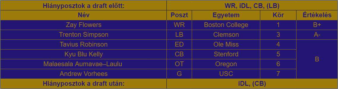 A Ravens neve nem sokszor merült fel a nyertesek/vesztesek beszélgetésekben, mert amolyan csöndes draftot hoztak össze. Temérdek pick nem állt rendelkezésre, de ami igen, azokból szinte végig sikerült jókor jó játékost húzni. Az elkapó szekció befejezése volt a legnagyobb feladat, amit sikerült is megoldani már hamar és Flowers remekül is illik a meglévő állomány mellé. Egyedül a későre maradt corner húzás miatt lehet hiányérzet és esetleg a belső védőfallal kapcsolatban, bár utóbbiban darabra megvan a gárda, top név pedig már az első körben sem volt elérhető az esetükben, így amiatt kevésbé lehet hibáztatni a gárdát.