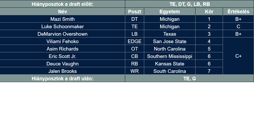 Ezenkívül persze a csapat hiányposztjait is igyekezett betömni, azonban az első számú tight end posztot Schoonmaker kiválasztásával továbbra sem érzem megoldottnak, továbbá a guard poszt mélysége sem megnyugtató. Érzésem szerint a csapat a 2. és a 3. napon nem optimálisan osztotta be az erőforrásait (a támadófallal túl sokáig vártak), és amikor választásra került sor, akkor pedig több alkalommal sem az adott poszt akkor éppen elérhető legjobb játékosát draftolták.