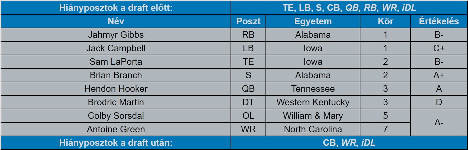 A Lions egy nagyon véleményes draftot produkált, amit nagyon sokan lehúztak. Bármennyire is szeretném, én sem tudom azt mondani, hogy ez egy tökéletes játékosbörze volt, de nem is annyira borzalmas, mint ahogy elsőre tűnik. Amennyiben a konszenzus boardok alapján 15-17. Brian Branchet viszi ki az 1/12-es cetlivel, az 1/18-assal a top 21-25-ösnek tartott Gibbset, a két második körösét pedig ellövi a 40-55. közötti helyen szereplő Campbell-LaPorta duóra, vagy akár Hendon Hookerre, akkor az overall megítélés azért jóval pozitívabb lenne. Pláne, hogy azért próbált hiányposztokra lőni a csapat és legalább négy olyan újoncot választott ki, akik jó eséllyel idén kezdők lehetnek.