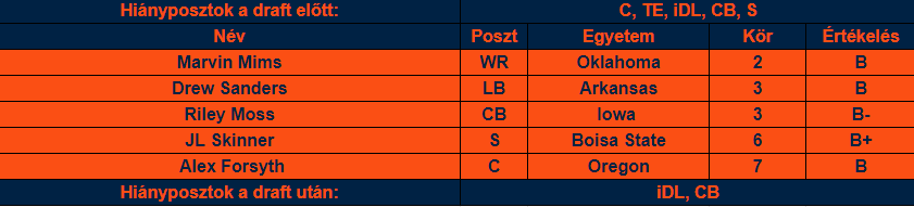 Ezzel a választással pedig egy elkapó, Marvin Mims Jr. érkezett. Sok hiányposztja volt a csapatnak, de az elkapó pont nem tartozott igazán közéjük. A kezdő ha éppen nem sérült, akkor a Sutton, Jeudy, Patrick trióval a liga top10-es alakulata is lehetne és mögöttük még olyan nevek vannak mint KJ Hamler vagy a Sean Paytont követő Marquez Callaway.