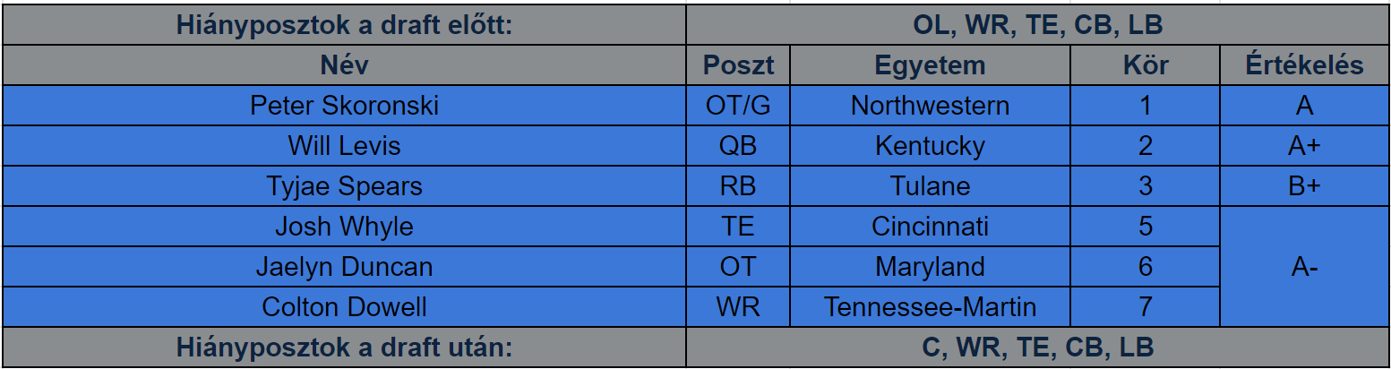A Titans idén belekezdett egy kisebb újjáépítésbe, aminek az egyik legfontosabb eleme egy új franchise irányító megtalálása volt. Ez végül, ha szerencsével is, de sikerült, ráadásul ezen kívül is nagyon jó draftja volt a csapatnak.