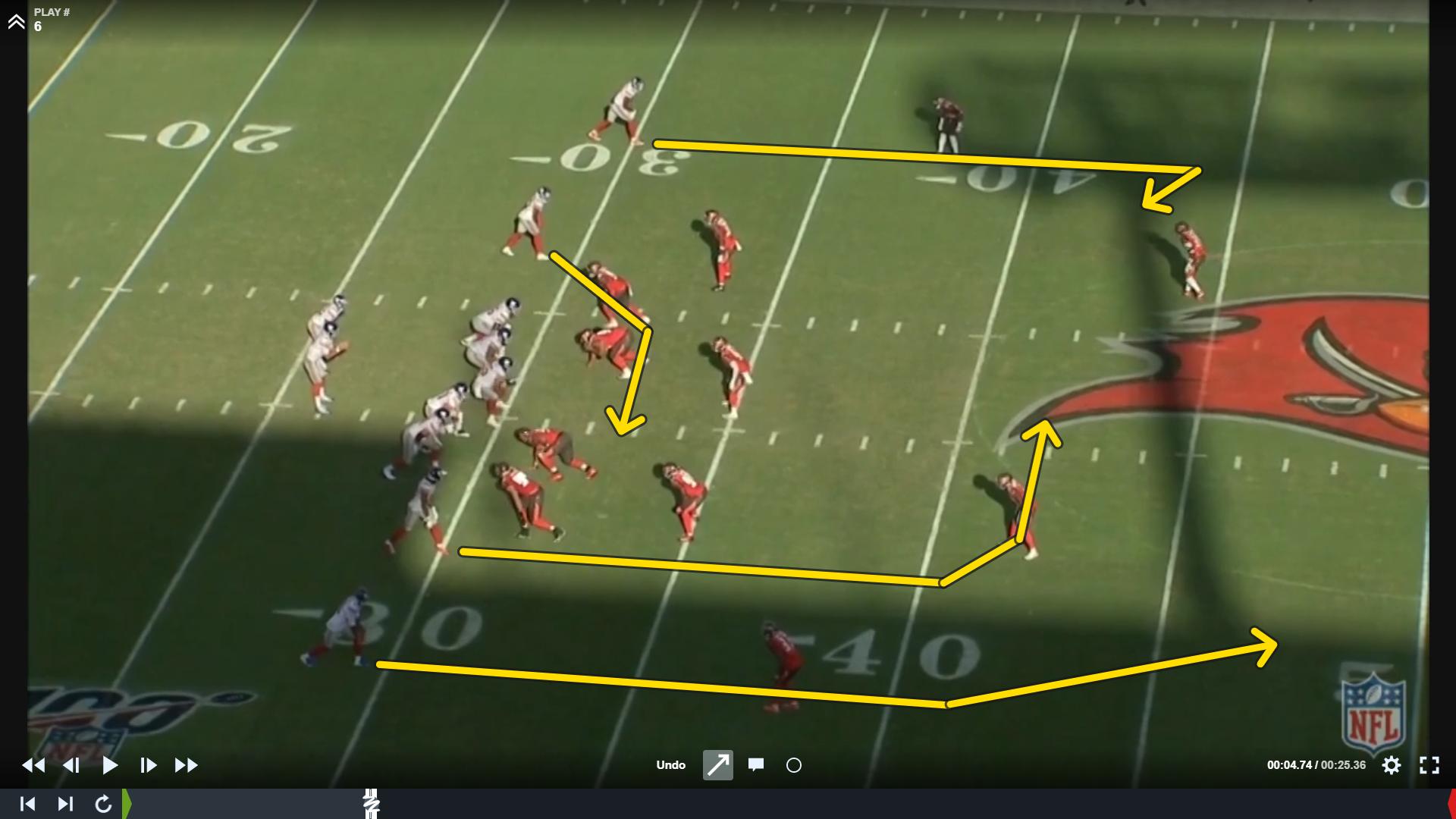 Itt a Giantsnél megvan a klasszik drag útvonal, a túlszélen pedig egy deep curl, ami nem engedi, hogy a corner és a safety mélyre menjen.
