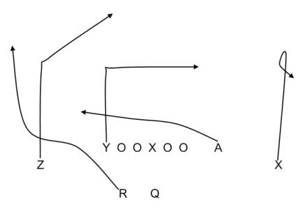 A túloldali szélső WR-re pedig olyan útvonalat kell rajzolni, amivel elvonja minimum a szélső CB, de jó esetben az ő oldalán felálló safety figyelmét is. Ez lehet egy go útvonal a fenti ábrán, de még jobb esetben egy befelé induló, majd kifelé vágó corner, amivel magára vonzza mindkét hátsó védő tekintetét. Ez látható itt Spurrier playbookjában négyből háromszor.