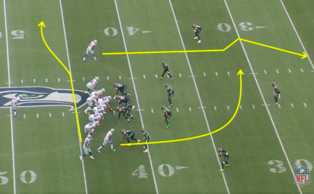 Ahogy a Mills koncepció esetében, itt is meg lehet kicsit csavarni a post útvonalat azzal, hogy “dino” útvonallá alakítjuk, azaz nem egyből vágunk be középre, hanem előbb elhitetjük a CB-vel, hogy kifelé akarunk vágni, így még jobban lerázva magunkról. Itt a Washington klasszikusan heavy personnel (fullback is a pályán), condensed formation kombóból futtatja a játékot play actionnel karöltve: