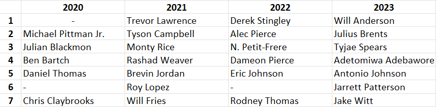 Az összlétszám után nem meglepő, hogy indianapolisi fölény mutatkozik a draftoltaknál is: 9 játékost vettem Chris Ballard boardjáról. 6-6 jött Houstonból és Jacksonville-ből és csupán 4 Tennesse-ből.