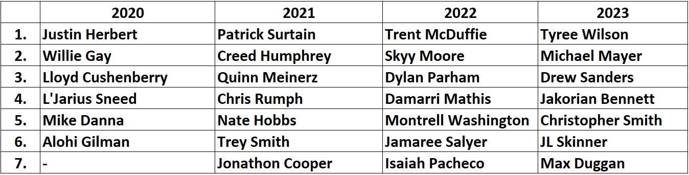 A Raiders viszont teljes katasztrófa. Henry Ruggs, Damon Arnette, Lynn Bowden, Bryan Edwards és Tanner Muse volt a csapat 2020-as teljesítménye, de egyik top 100-as pick sem vált be, ráadásul Ruggs azóta már börtönben van, de Arnette is jó úton halad. Egy évvel később négyszer választhatott a csapat a top 80-ben, de Alex Leatherwood, Trevon Moehrig, Divine Deablo és Malcolm Koonce sem váltotta be a hozzájuk fűzött reményeket, a 2022-es magas pickeket meg ellőtte Davante Adamsre a gárda. Így nehéz jó csapatot építeni.