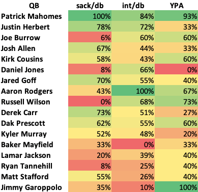 Először azokat az irányítókat vizsgáltam, akik kezdők lesznek az előttünk álló idényben és legalább 2000 dropbackkel rendelkeznek karrierjük során (tehát gyakorlatilag kivettem azokat, akik csak egy-két évet játszottak). Náluk tehát teljes karrierjüket figyelembe vettem, ami értelemszerűen jobb képet ad, mintha csak egy szezont vizsgálnánk. Fontos kiemelni, hogy minél magasabb egy szám, annál jobb volt az irányító az adott kategóriában (tehát Mahomes nem a legtöbb sacket nyeli be, hanem a legjobb annak elkerülésében).